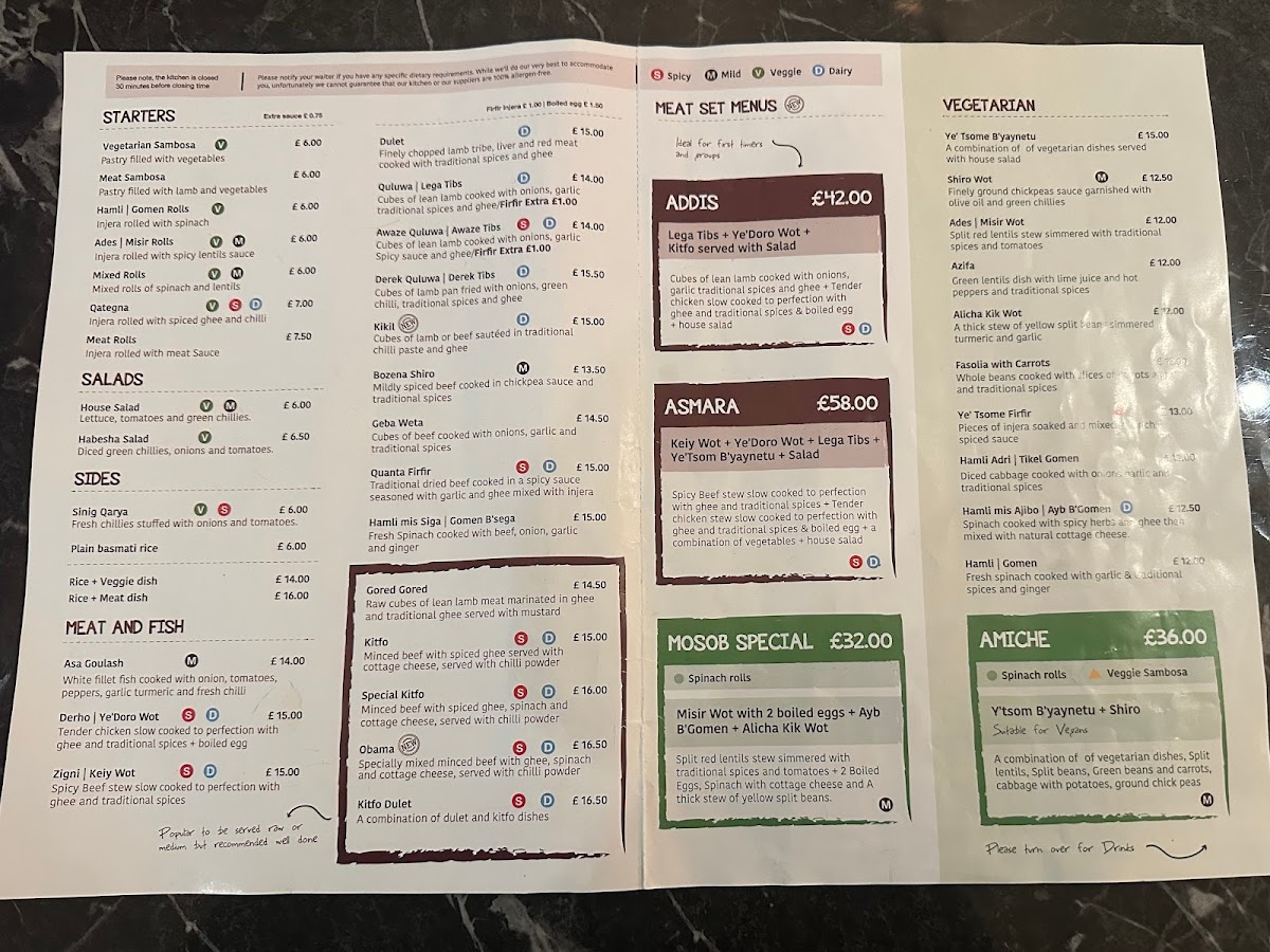 Mosob Restaurant, located at 339 Harrow Rd in Maida Hill, London, delivers an authentic taste of Ethiopian and Eritrean cuisine that captivates both first-timers and seasoned diners. The menu boasts a remarkable array of dishes, ensuring there’s something for everyone, including an impressive selection of vegetarian options. Customers rave about the generous portions and fair pricing, with dishes like the Obama special—raw minced meat—receiving particular acclaim for their extraordinary flavors.